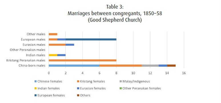 The present study, having been provided access to earlier records, shows unmistakably that intermarriages took place within the racially mixed congregation and were more prevalent than previously believed, most significantly between newly arrived China-born Teochew males and females from the old Peranakan Kristang community.27 The graphs on page 62 address the marital unions from the reference point of the male partner,