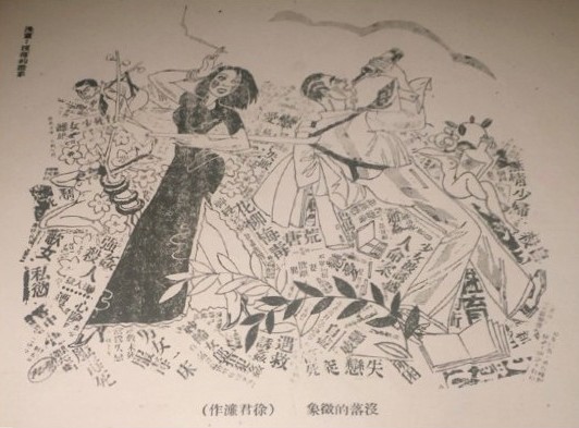 Shu was probably more prolific in producing graphic and design works. He was close to his colleagues at Sin Chew Jit Poh, some of whom started a magazine dedicated to current affairs and contemporary literature called Up to Date (《今代》). Shu wrote fictional pieces and drew satirical cartoons for the magazine. An elaborate cartoon titled Signs of a Decline (没落的徵象) can be found in the inaugural issue of May 1934 (Figure 3). Around the same time, Shu started a short stint teaching art at The Chinese High School.