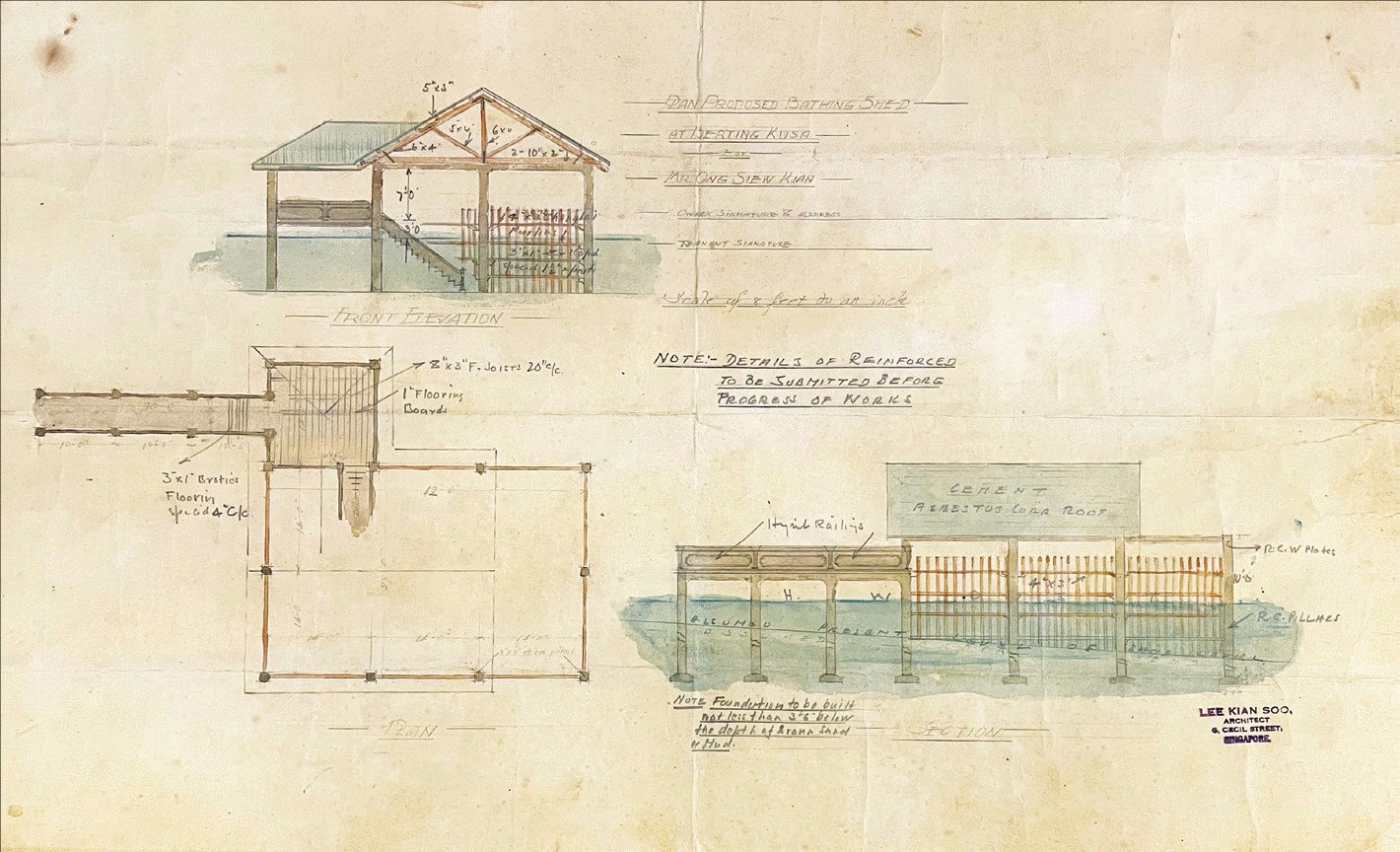 Over time, people built holiday homes along the coasts, following the enjoyable places for beach swimming and defining the areas of Singapore’s future suburban expansion. They moved to Pasir Panjang and Tanjong Katong, places that provided access to the beach, and bathing activities were gradually formalised through the design and construction of personal piers, bathing rooms and pagar. For the wealthy, bathing in the sea was always available, and this developed a coastal architecture of swimming that emulated at smaller scale the ambitions of larger bathing schemes. Figure 3, for example, shows a private pagar, designed by the architect Lee Kian Soo for Ong Siew Kiam in Kampong Beting Kusa, a coastal village near Changi, sometime in the 1920s. The structure included the conventions of old bathing enclosures, while making use of modern construction. Its posted fence resembled the old nibong palm structures of earlier pagar, while using concrete foundations to secure the enclosure. Lee created a pier from the shore, leading to a swimming area in deeper water, which was half-covered with asbestos roofing to protect swimmers from the sun. The structure was more refined than earlier built examples, though it ultimately followed conventions of bathing architecture that had been in place since 1827.