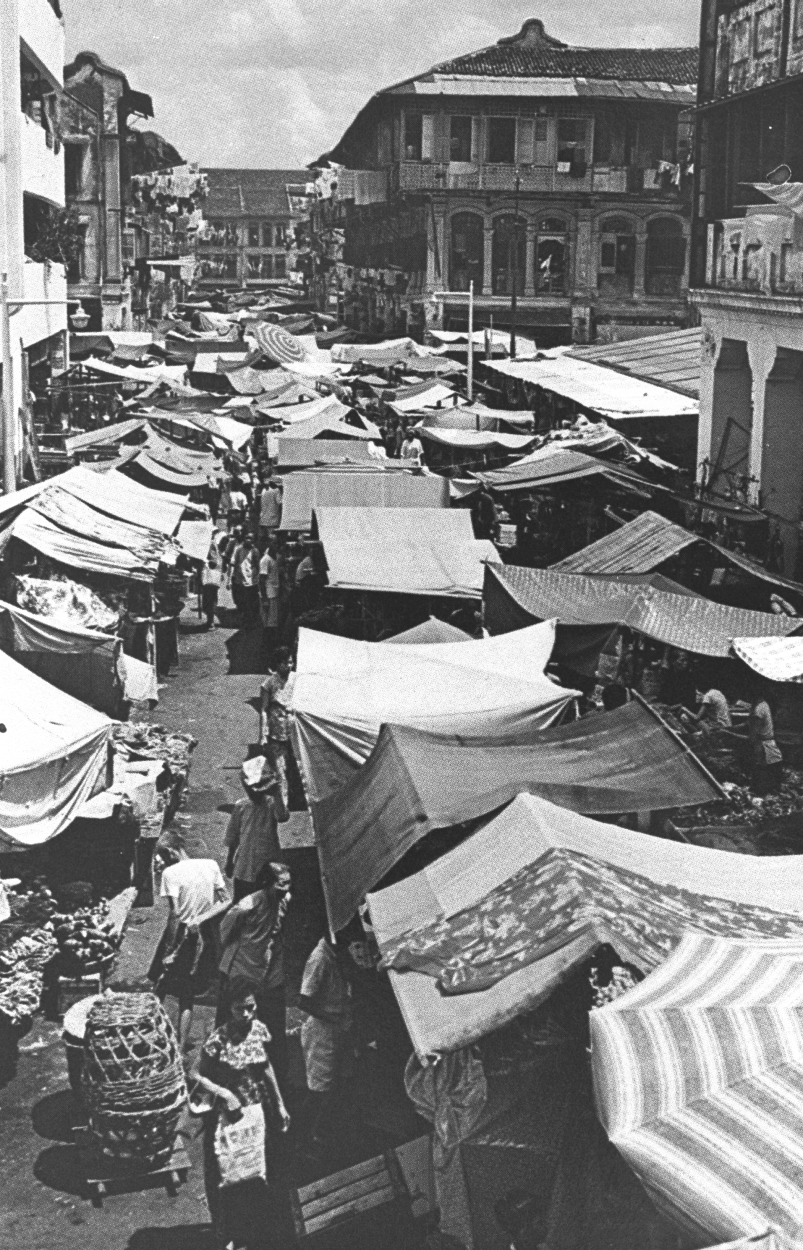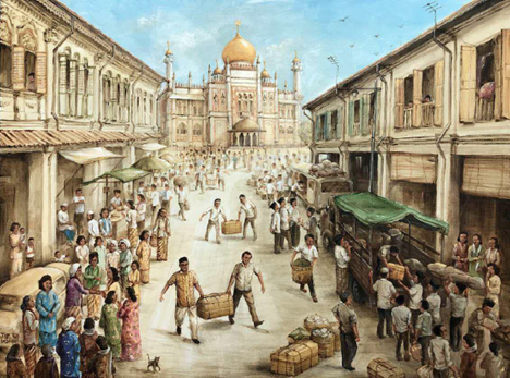 A wet market on Trengganu Street, Chinatown, c. 1960. In the background is the former Lai Chun Yuen Opera House. Tan Kok Kheng Collection, courtesy of National Archives Singapore (Media - Image no. 19980005922 - 0089).In works like “Trengganu Street Market”, Yip drew from his own memories growing up in Chinatown. However, in other works, archival research and old photographs play a bigger role. In “Preparing for the Haj” (2020), the canvas captures a cross-section of Bussorah Street bustling with activities surrounding the Haj preparations, with the grand Masjid Sultan (Sultan Mosque) in the background.6