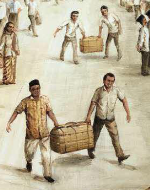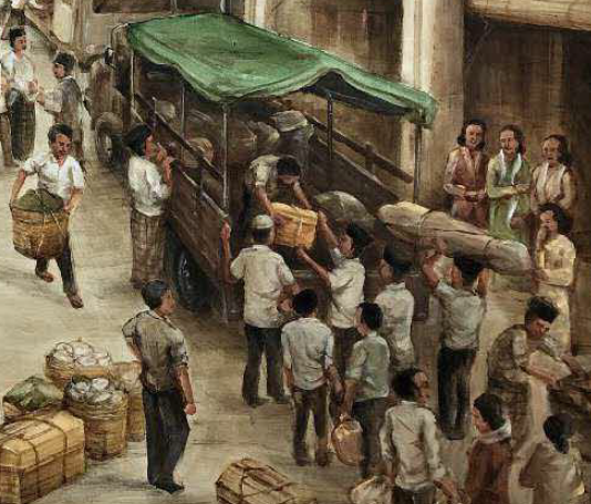 “Preparing for the Haj” (2020) captures the Haj preparations on Bussorah Street, with Sultan Mosque in the background. Courtesy of Yip Yew Chong.The work shows, among other things, two men walking down Bussorah Street, jointly carrying a trunk, while several others load luggage onto trucks as women gather nearby, waiting to bid farewell to departing pilgrims. These two elements in the painting were inspired by photographs (see here and here) that can be found in the National Archives of Singapore.