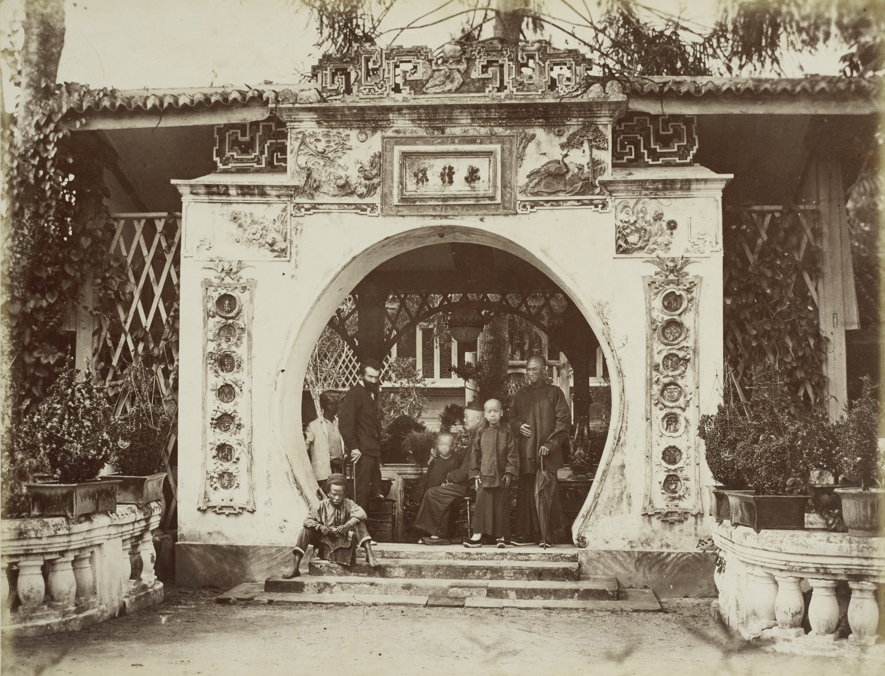 Photographs of the house in Whampoa’s time show that it had a solid exterior along the lines of Victorian English architecture. Initially constructed in timber around 1840, the house was later expanded with brickwork in 1855. The main entrance with a carriage portico, typical of the period, opened directly into a large and very grand dining room. The house was flanked by verandas, with lounge rooms, bedrooms and more verandas on the second floor. Chinese elements such as the moon gate (a circular or arched opening in a wall or garden structure) – where Whampoa was photographed with his wife and two of his children – were interspersed with gazebos. The 30-acre property included annexes housing the kitchen, stables and living quarters for servants.7