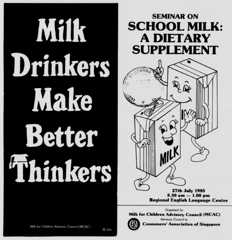 Possibly to further combat falling milk consumption in schools, the Consumers’ Association of Singapore set up the Milk for Children Advisory Council (MCAC) in 1982.17 The council complemented the Education Ministry’s efforts to encourage milk drinking in primary schools, said Ivan Baptist, the executive secretary of the Consumers’ Association.